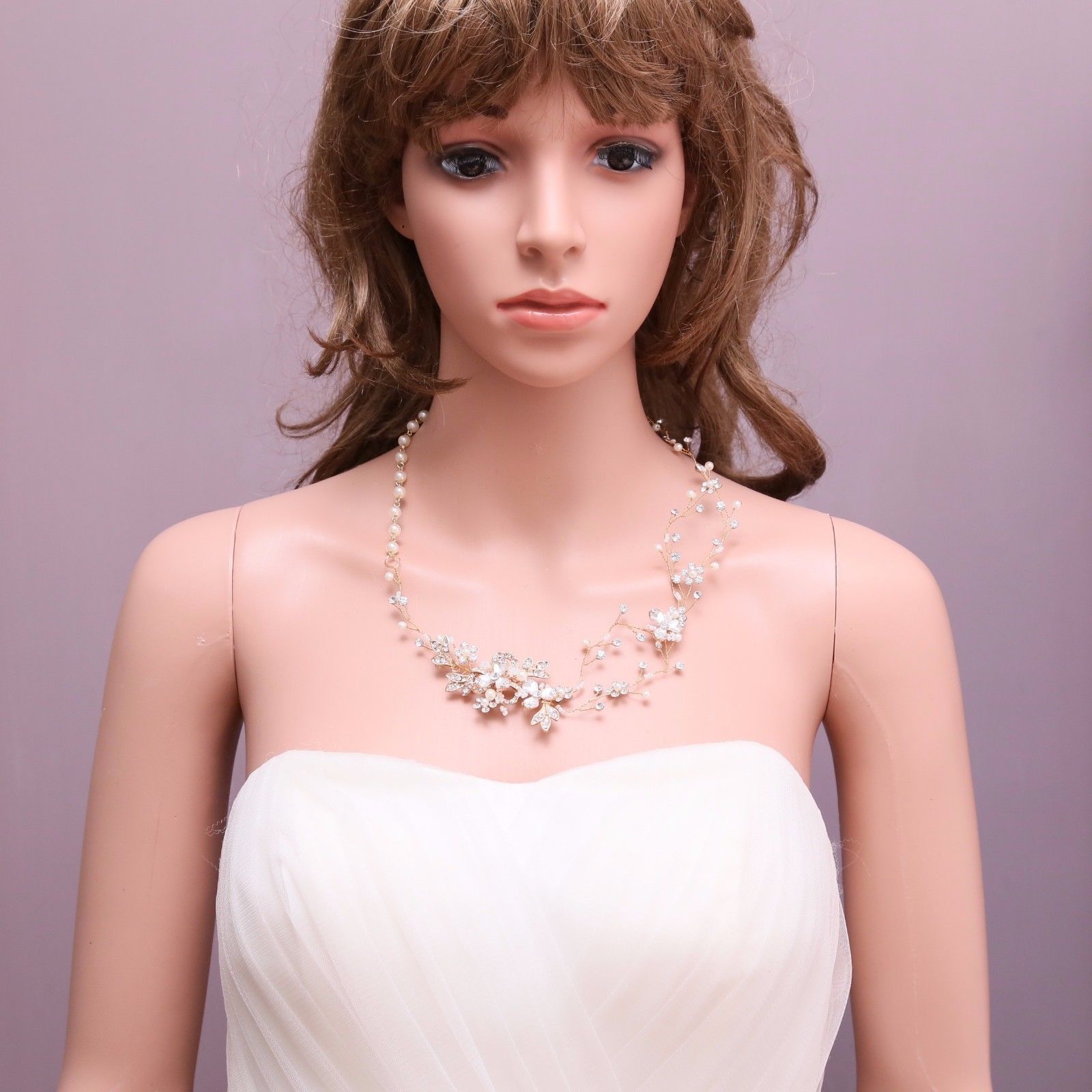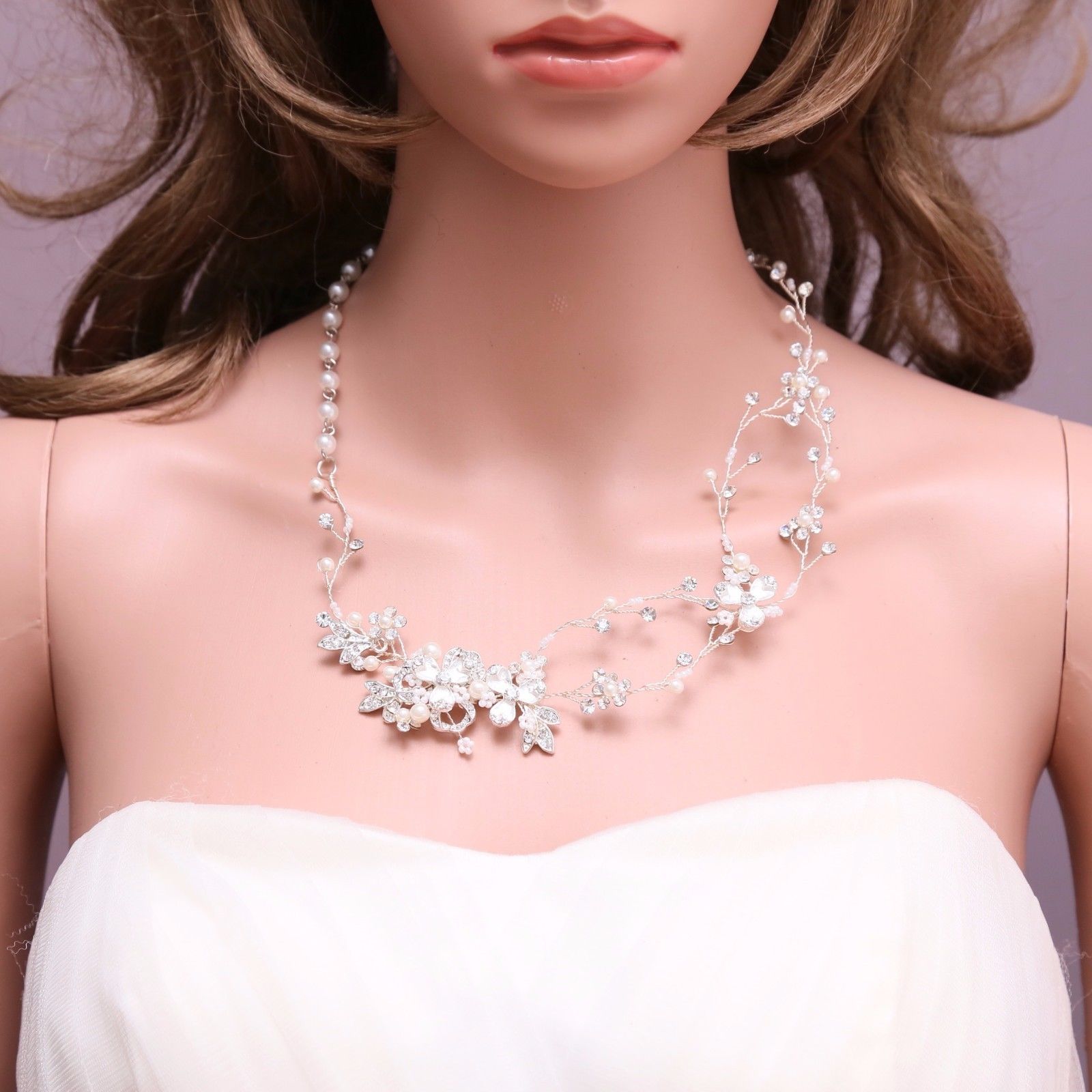 Leaf Rhinestone Flower Pearl Chain Silver Choker Necklace Wedding Jewelry