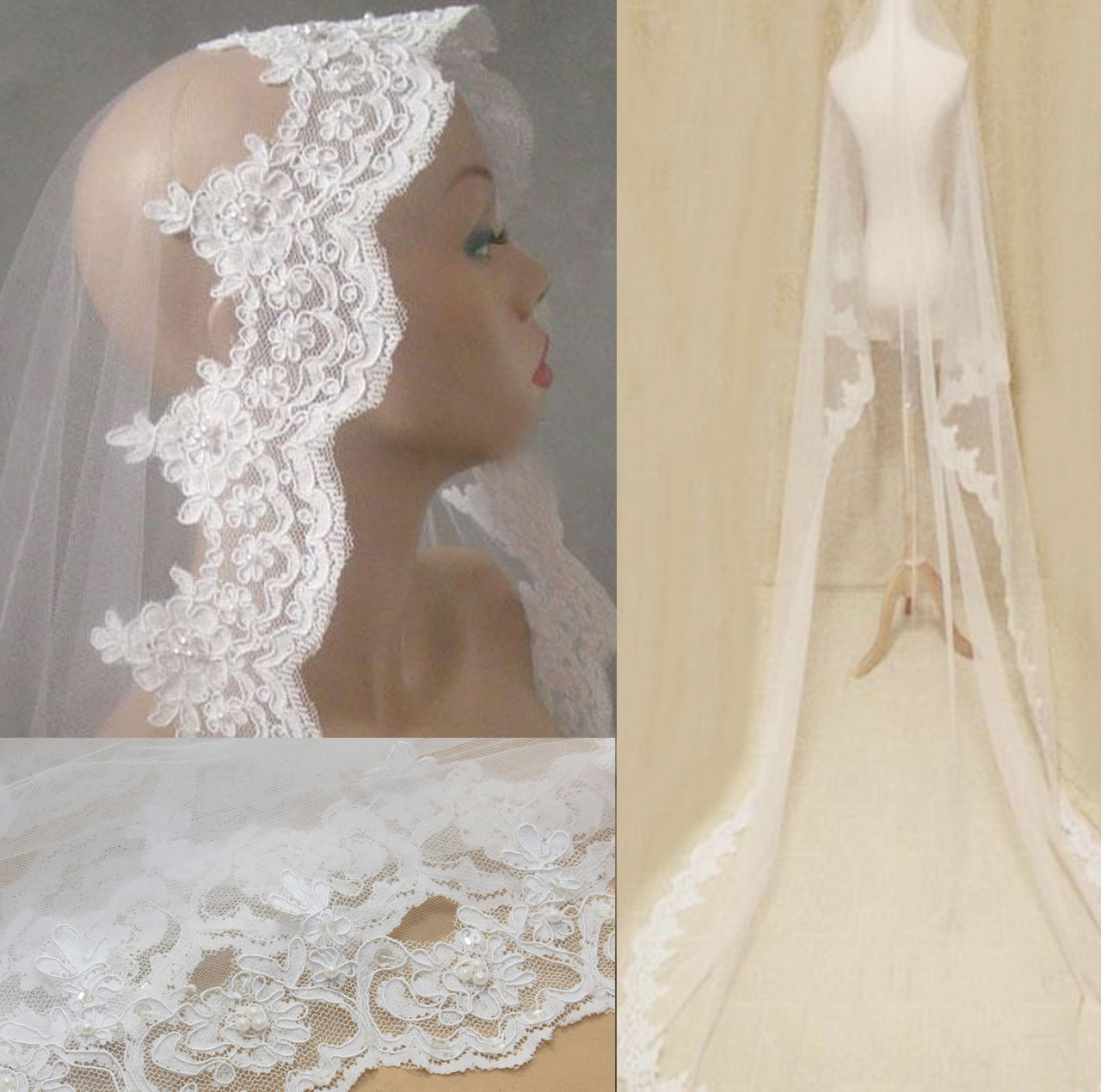 White/Ivory 3m Long 1 Tier Vintage Bridal Style Lace Pearl Tulle Wedding Veil