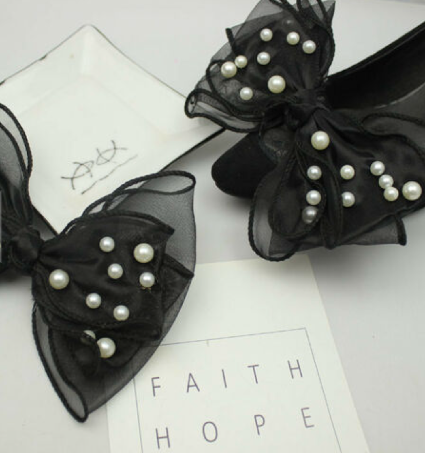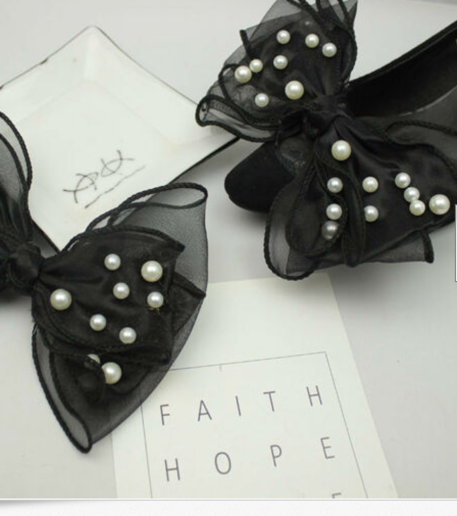 2 pcs -Fashion Pearl Black Organza Bow Flower Sandals Shoe Clips
