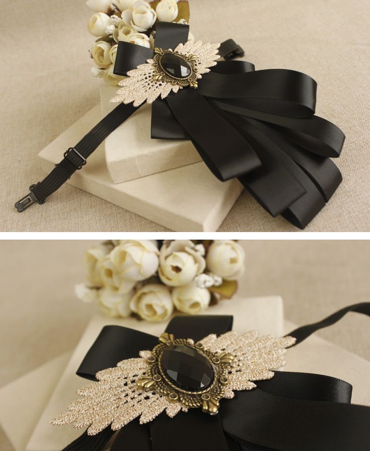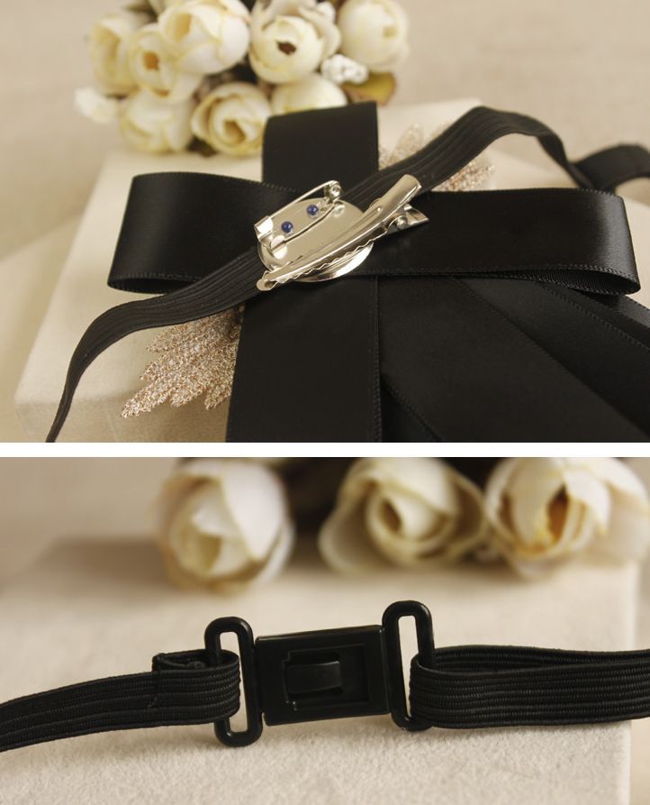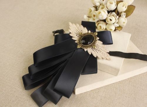 Vintage Style Black Ribbon Wedding Men Pre Tied Lace Bow Tie Brooch Pin Clip