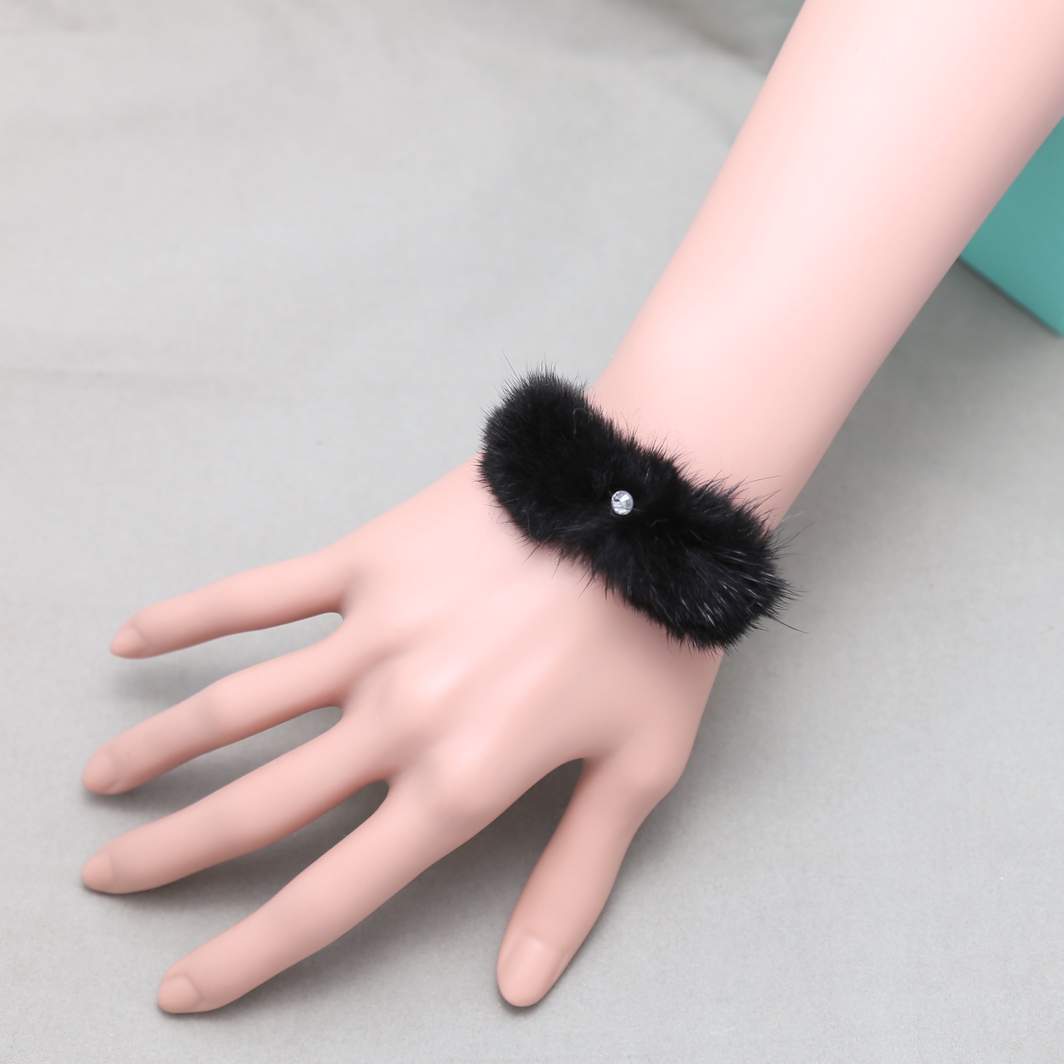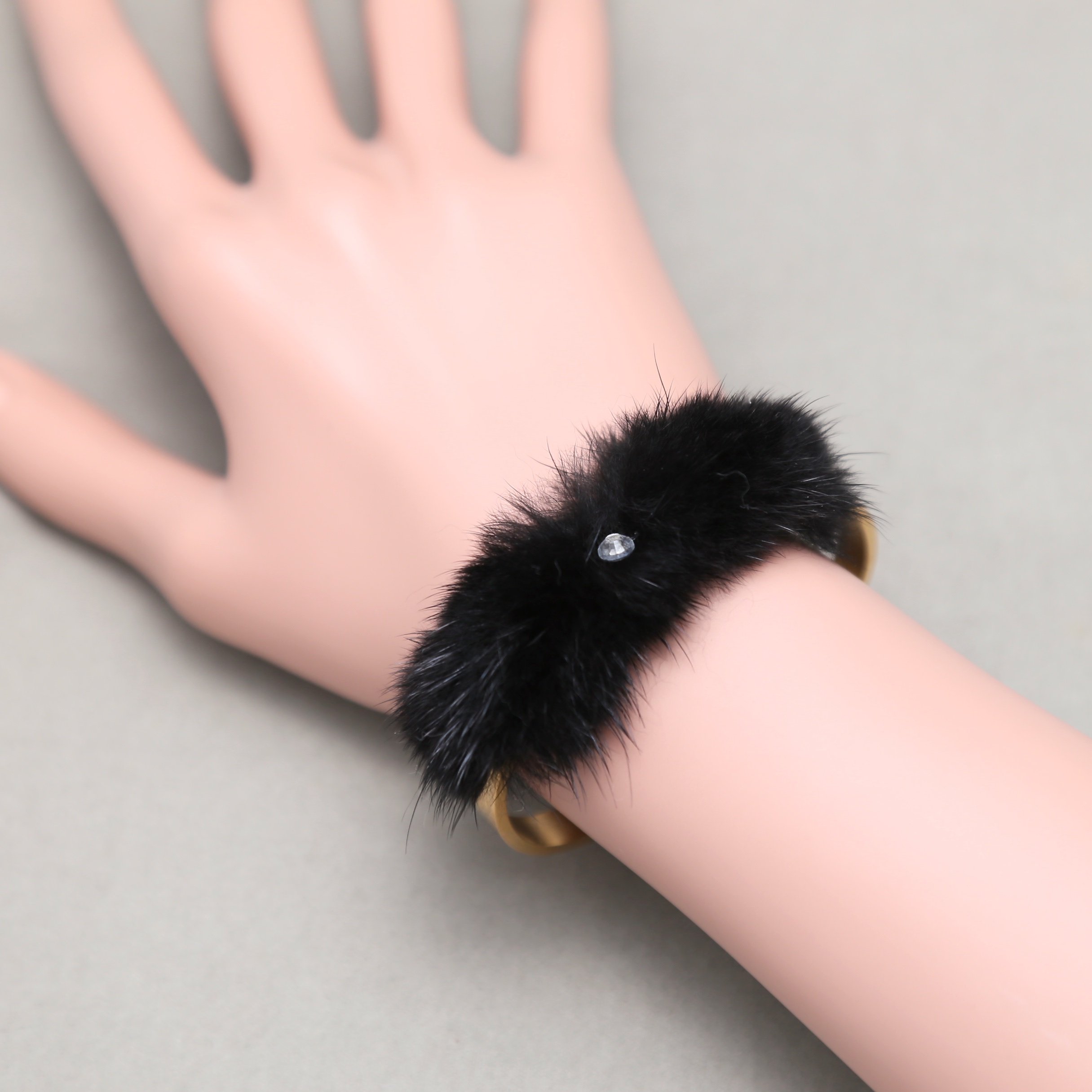 18K Gold Plate Pom Ball Black Fur Rhinestone Crystal Bracelet Bangle Cuff