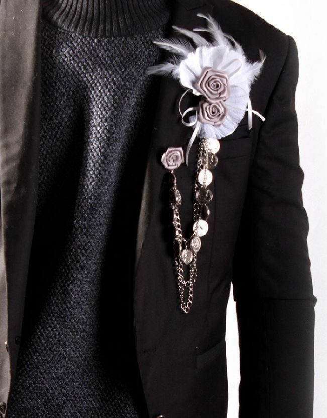 Grey White Flower Feather Mens Wedding Brooch Pin Chain
