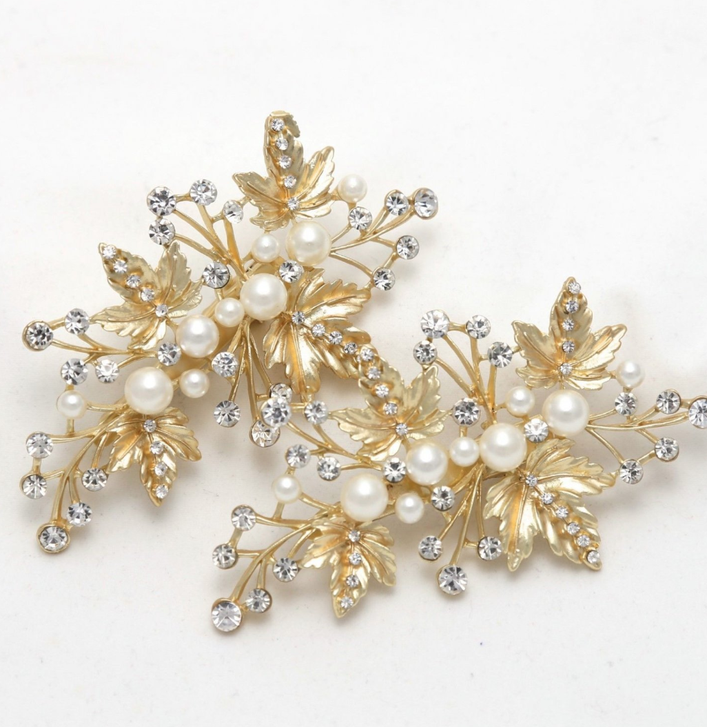 1 Piece Ivory Pearl Beaded Wedding Gold Leaf Hair Clip