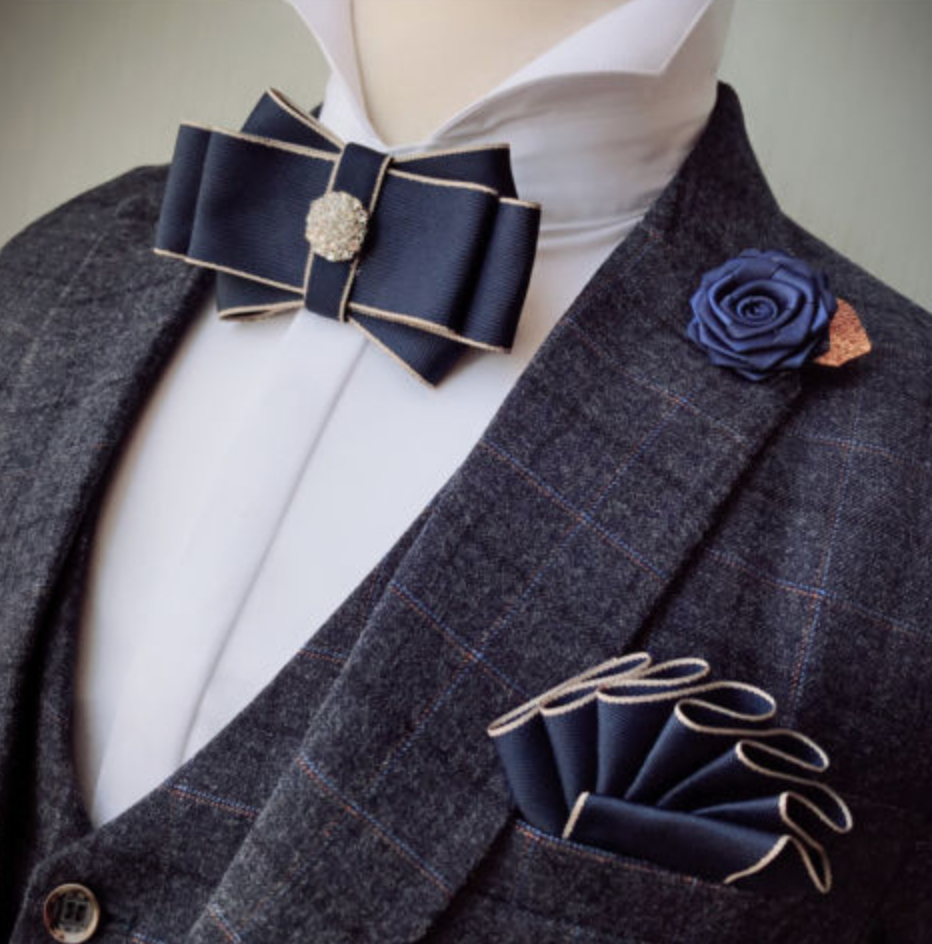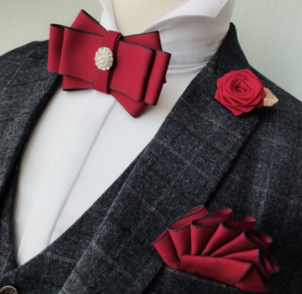 3 Items - Men Pre Tied Crystal Bow Tie Rose Boutonniere Pocket Brooch Pin