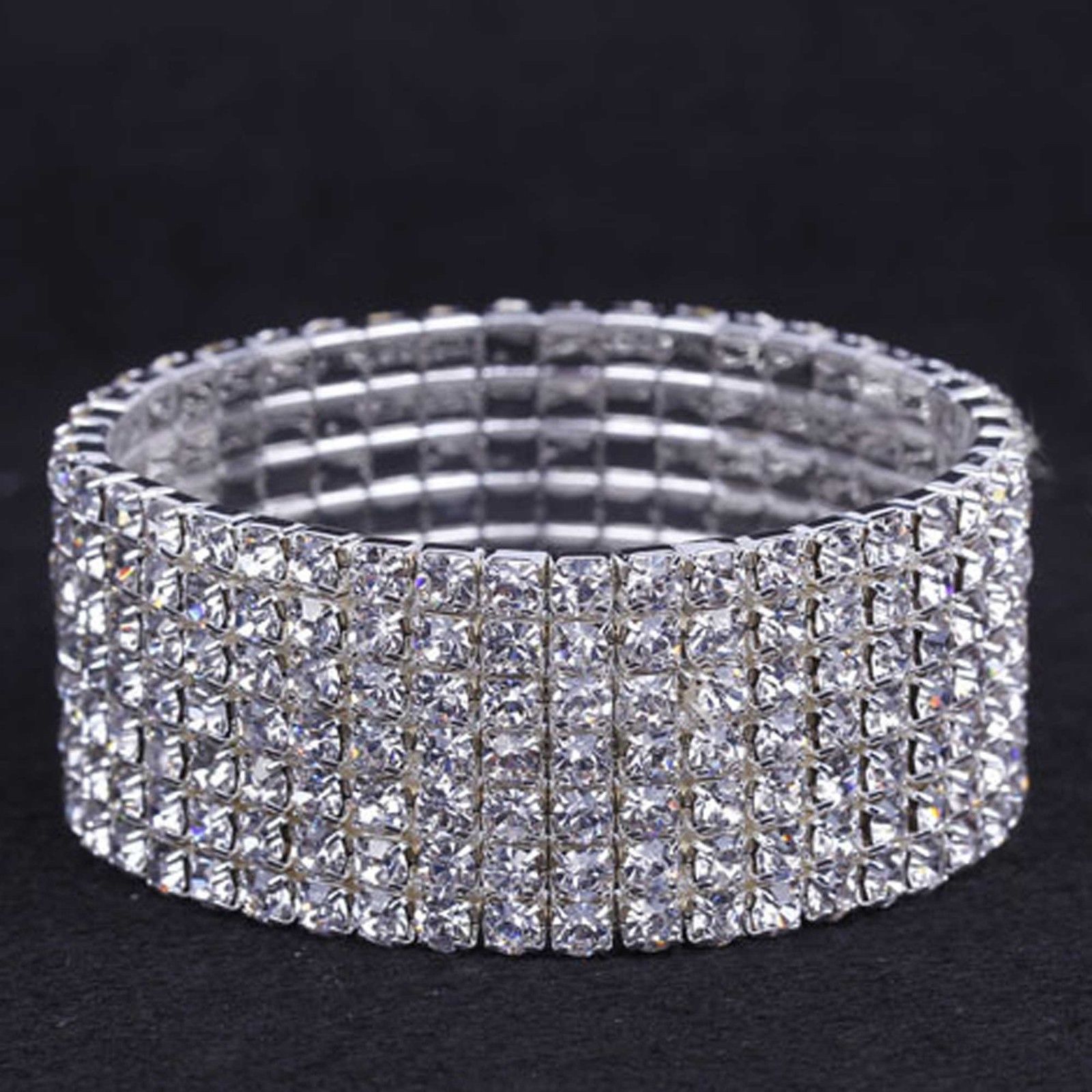 7 ROWS DIAMANTE RHINESTONE CRYSTAL WEDDING BRIDAL ELASTIC BANGLE BRACELET CUFF
