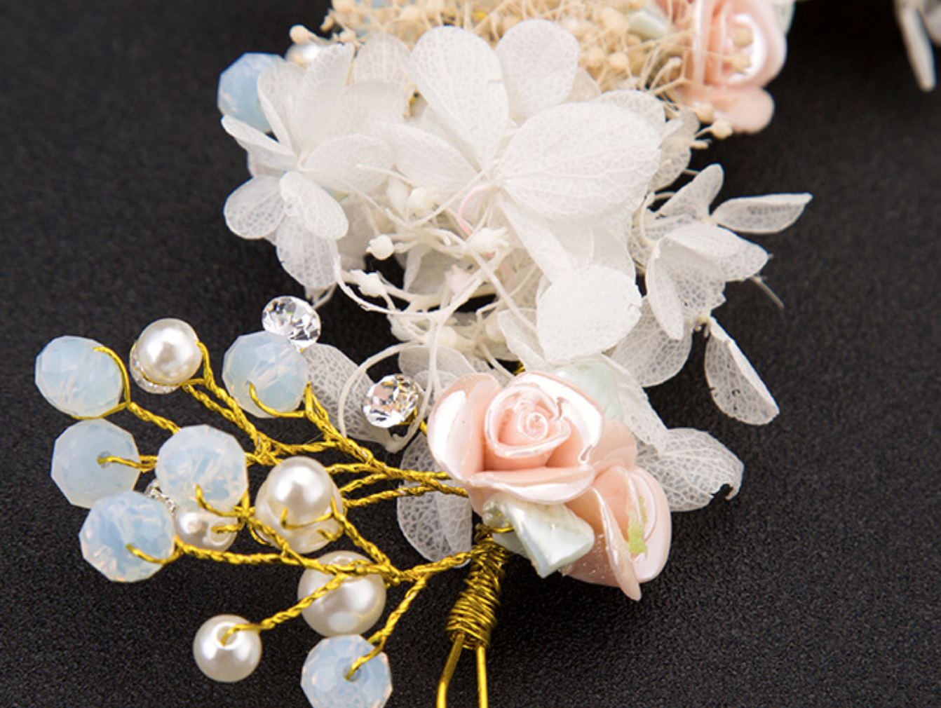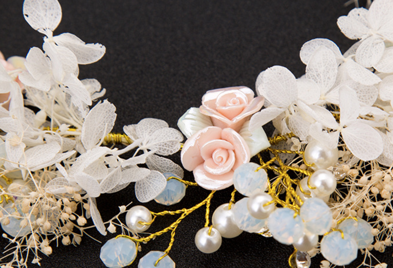 Dried Flower Pink Cream Tone Hair Tiara Crystal Beaded Wedding Headpiece Jewelry