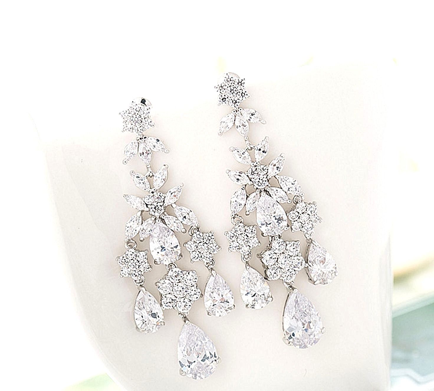 Cubic Zirconia Platinum plating Silver Clear Drop Dangle Chandelier Earrings