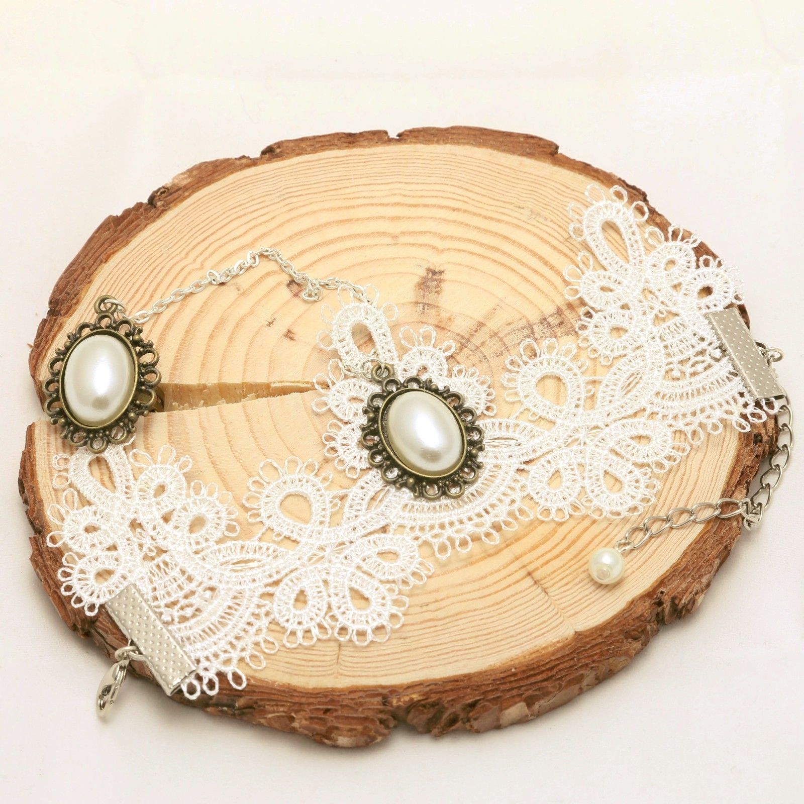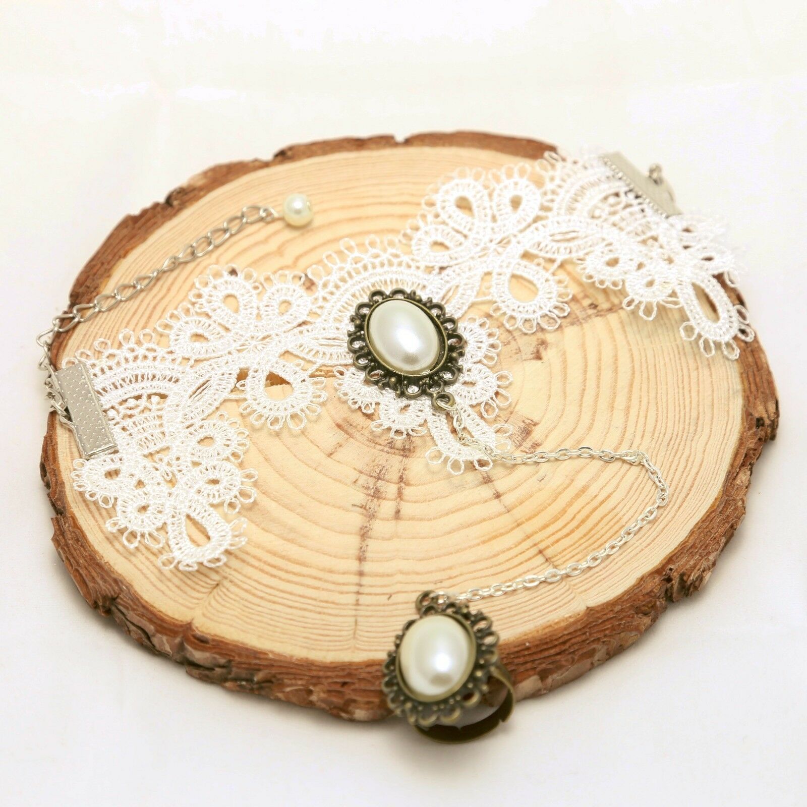 Gothic Off White Flower Floral Vintage Style Pendant Lace Slave Ring Bracelet