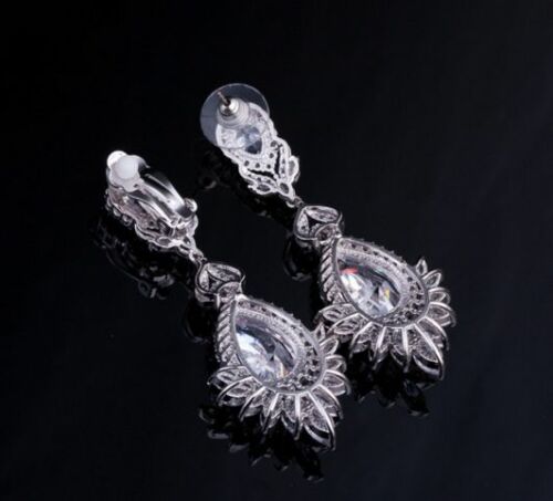 Cubic Zirconia Platinum plating Silver Clear Drop Dangle Clip Earrings