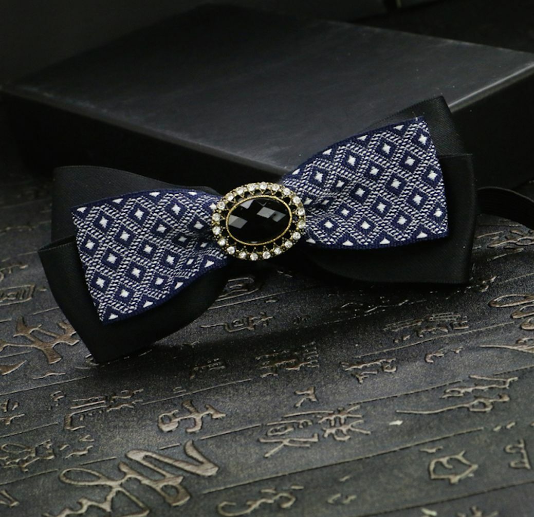 Dark Blue Pre Tired Self Bow Tie Mens Checked Crystal Wedding Black Bowtie