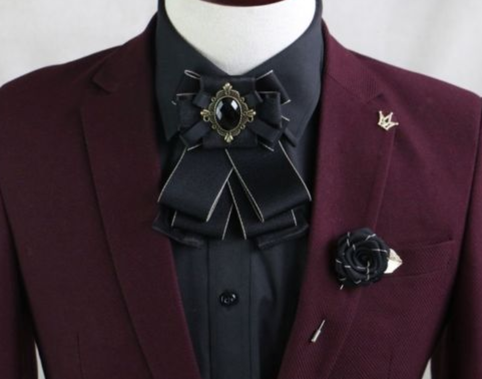 2 Items - Set Of Black Ribbon Wedding Men Pre Tied Bow Tie & Rose Boutonniere Brooch Pin