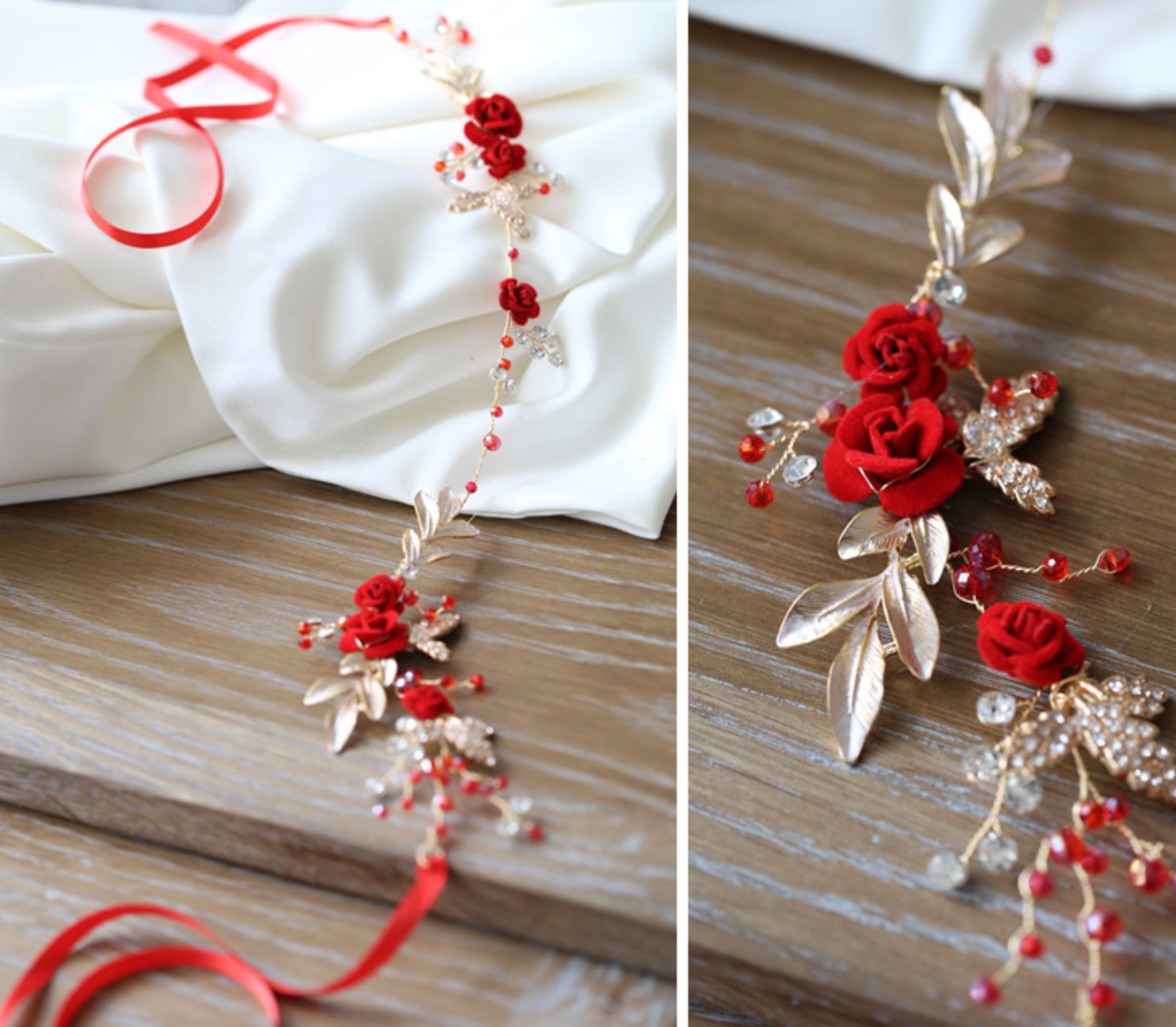 Wedding Rhinestone Crystal Red Rose Flower Gold Silver Bridal Hair Headband Tiara