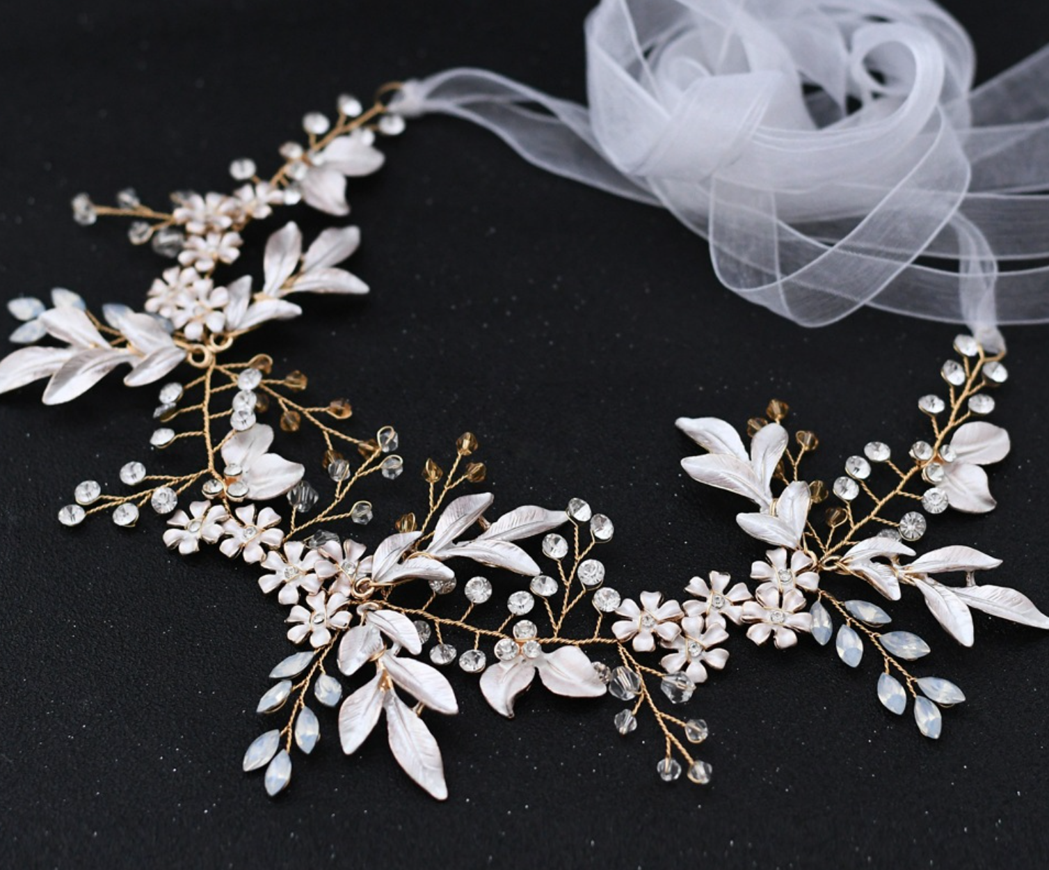 Diamante Rhinestone White Plate Gold Leaf Crystal Waist Wedding Sash Belt