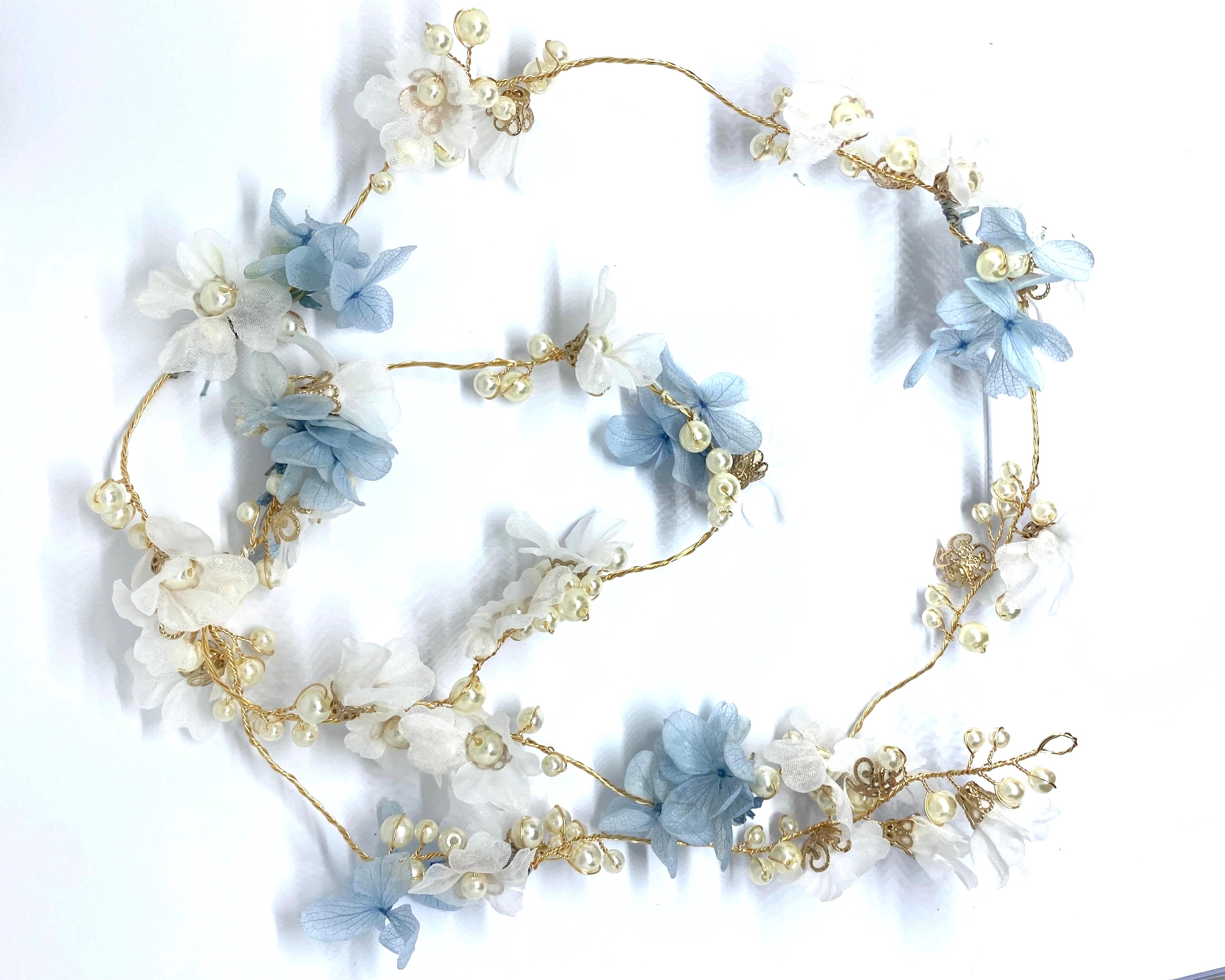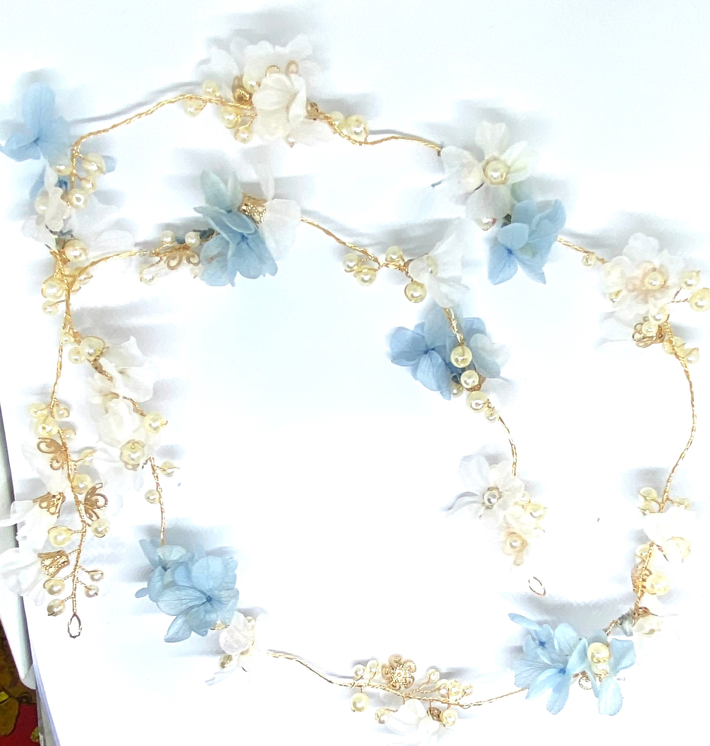 Properties: crystal beads, silk flower, preserved blue or white flower