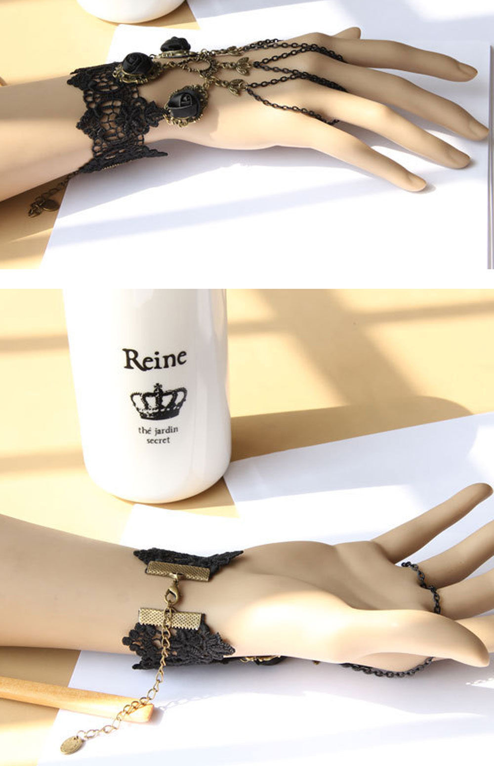 FREE SHIP -GOTH BLACK LACE APPLIQUE ROCOCO VICTORIAN SLAVE BRACELET WITH BLACK SATIN ROSES