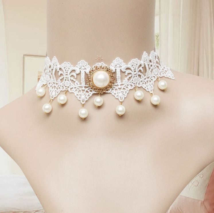 White Lace Ribbon Gothic Necklace Goth Victorian Faux Pearls Rococo Choker