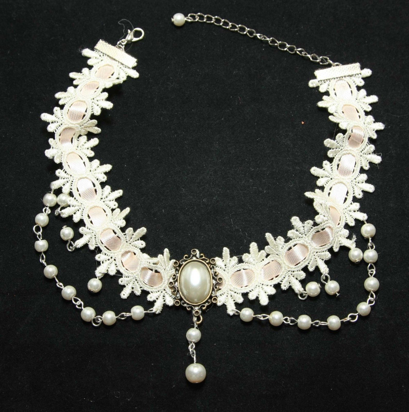 Ivory Wedding Lace Bridal Pink Ribbon Romantic Necklace