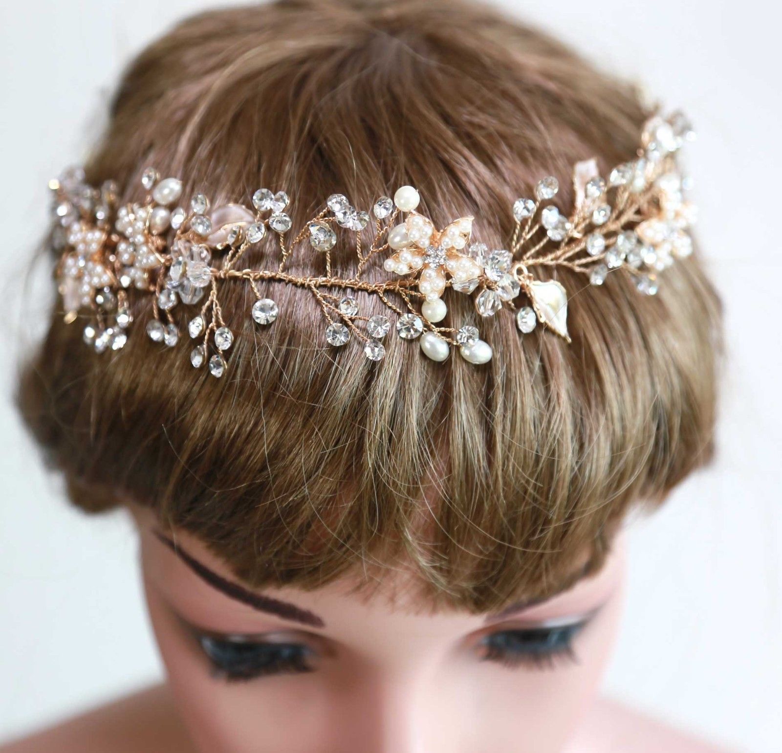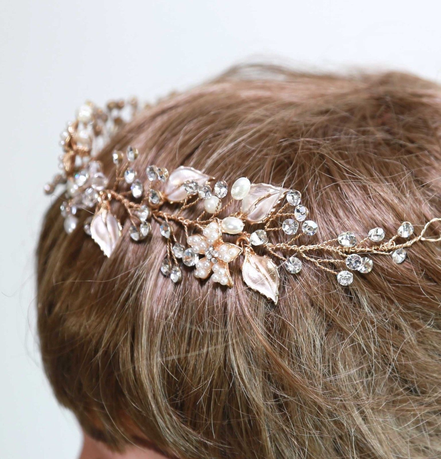 Faux Pearl Gold Bridal Wedding Rhinestone Crystal Gold Flower Vines Hair Tiara